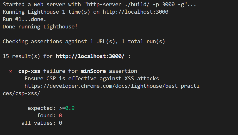 This means that Lighthouse CI ran on the local code and found 15 issues for me to work on at the end of the run it also gives a path to a URL where it creates a report in HTML Format.