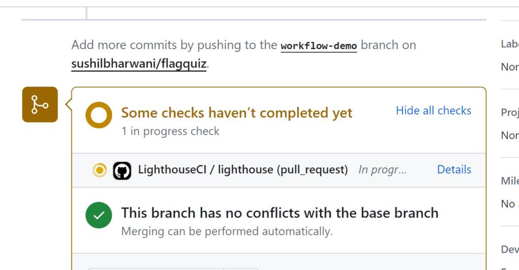 Here we can see that there are LighthouseCI checks in progress, We can click on the details links to see all checks running.
